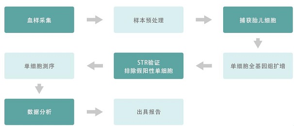 可早在孕婦懷孕10~12周,抽取孕婦20ml的靜脈血,運用精準生物專有的全自動熒光染色希有細胞捕獲平臺,分離出痕量、完整、活性的循環胎兒細胞,根據單細胞的全基因組信息,來判斷胎兒遺傳疾病的風險率。是目前已知的最全面、最準確、最安全的產檢服務。同時,該技術還可應用於產前親子鑒定。